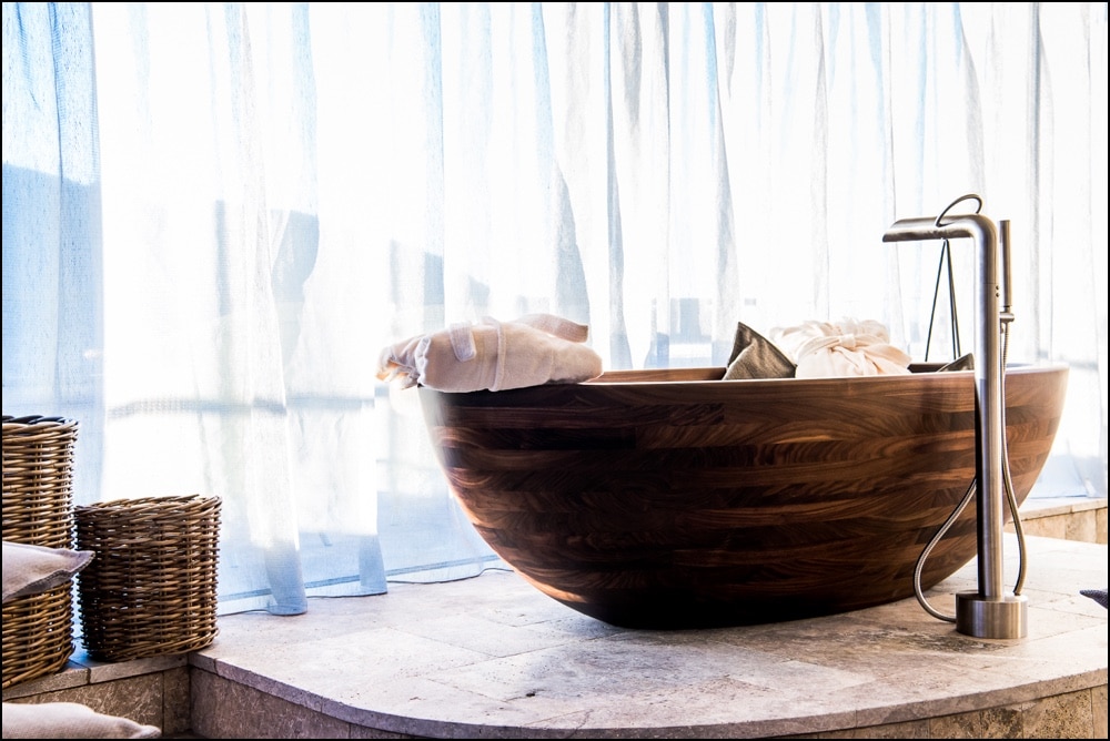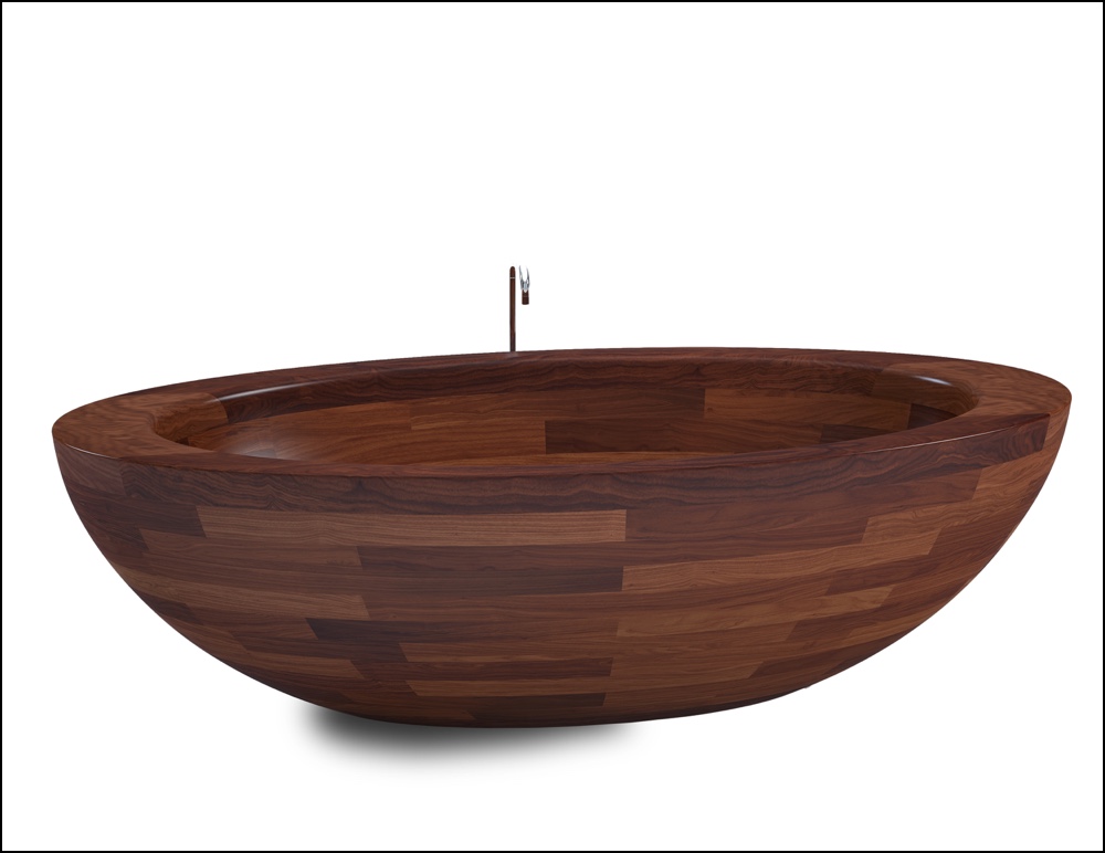 Freistehende Vollholzbadewanne „BAULA“ von UWD im modernen Oval Design, gefertigt zu 100% aus erlesenen Edelhölzern. Die Oberfläche ist dank eines aufwendigen Versiegelungs- und Imprägnierungsverfahren, bestehenden aus mehreren Schichten, besonders robust und unempfindlich gegenüber jeglichen Einflüssen im Badezimmer.